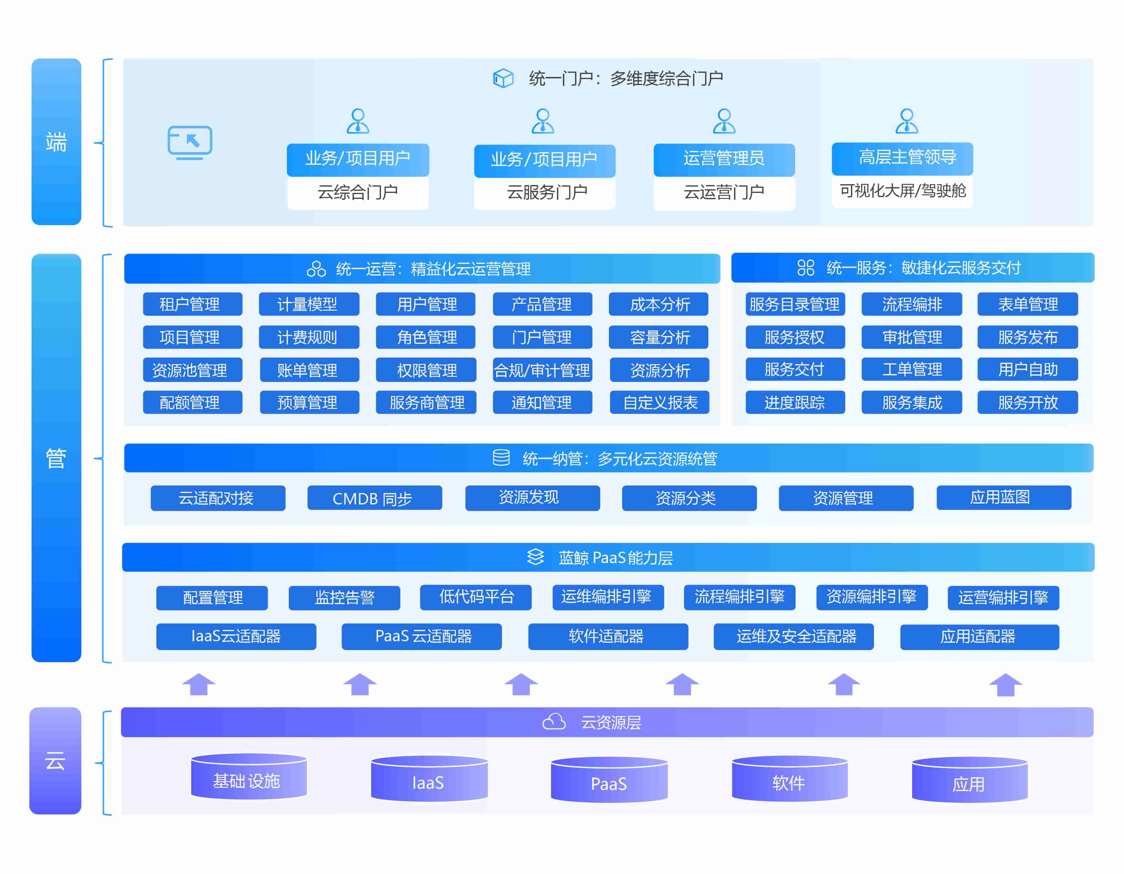 管:作為連接云與業務端的管道,提供統一納管、統一服務、統一運營、多樣化編排能力,實現管理標準化、資源服務化、交付自動化、運維場景化、運營持續優化,幫助管好云、控好云。