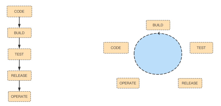 早期的項目使用的是“瀑布模型”進行軟件交付,即一個階段所有的工作完成之后再往下一個階段,但這樣的模式無法滿足業務快速開發交付及變更需求的情況,于是后面就出現了敏捷開發這一概念,即一種快速應對需求變化軟件開發能力,而DevOps就是基于敏捷開發將軟件開發/測試人員/IT運維關聯在一起,通過工具、組織等方式使開發、測試、發布流程自動化,讓軟件可以頻繁、高效的發布。